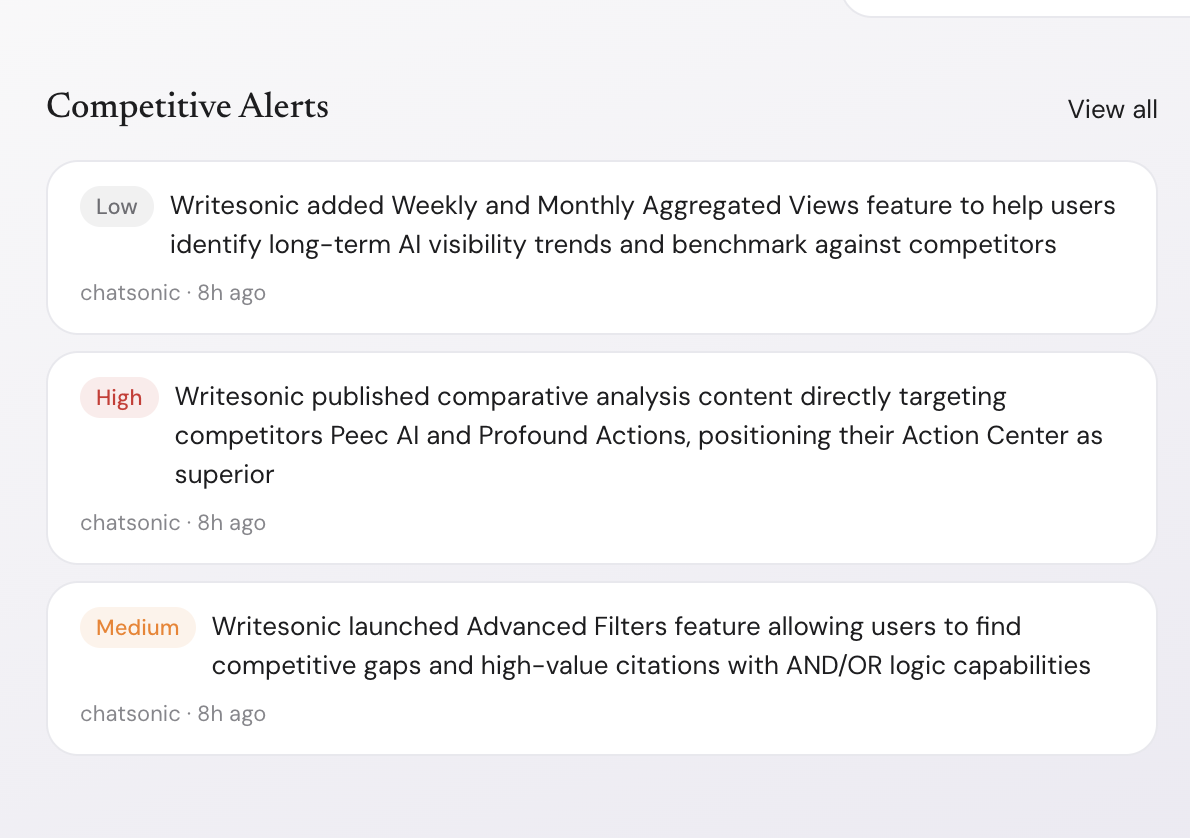 Instant notifications when competitors make moves. Ranked by severity so you focus on what matters.