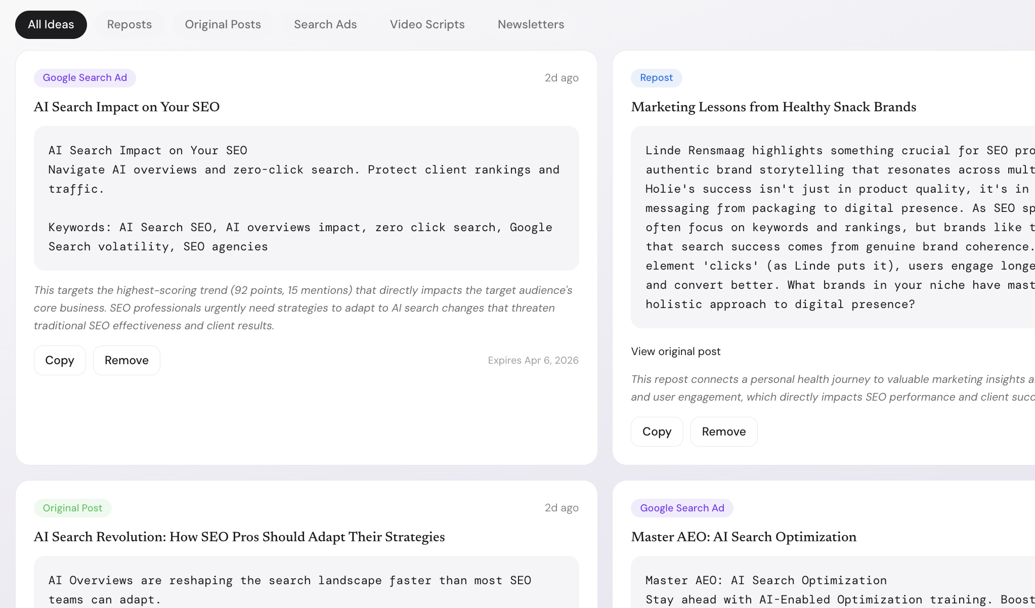 Generate LinkedIn post drafts, repost suggestions, search ad copy, video scripts, newsletter ideas, and blog topics based on live trends.
