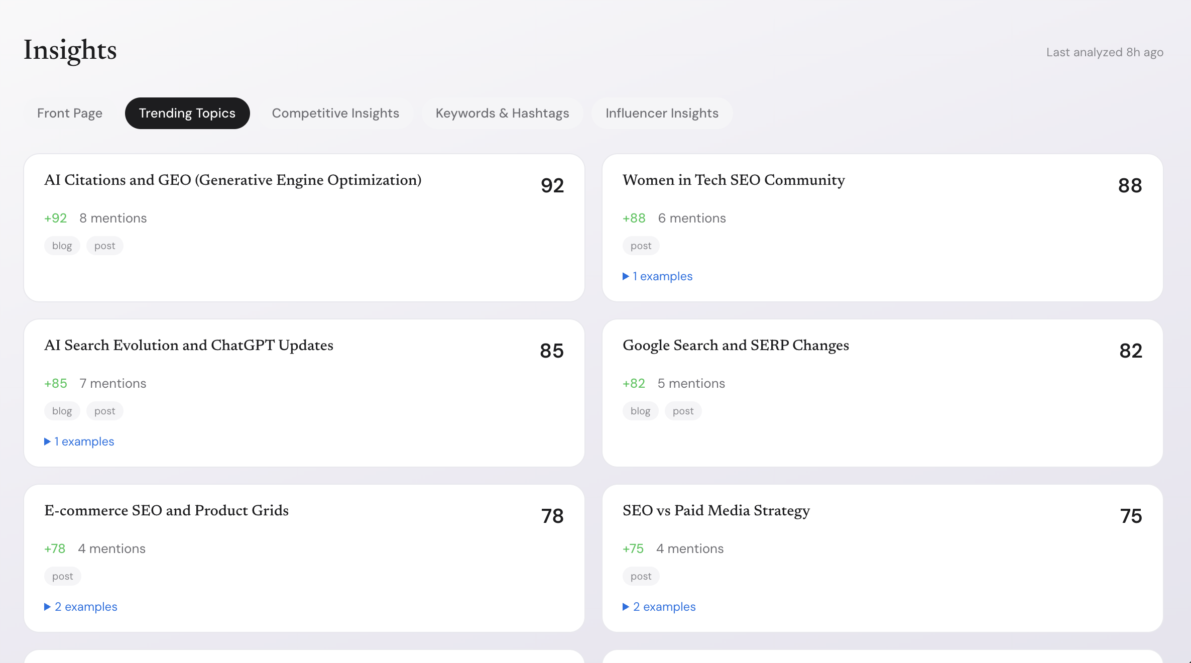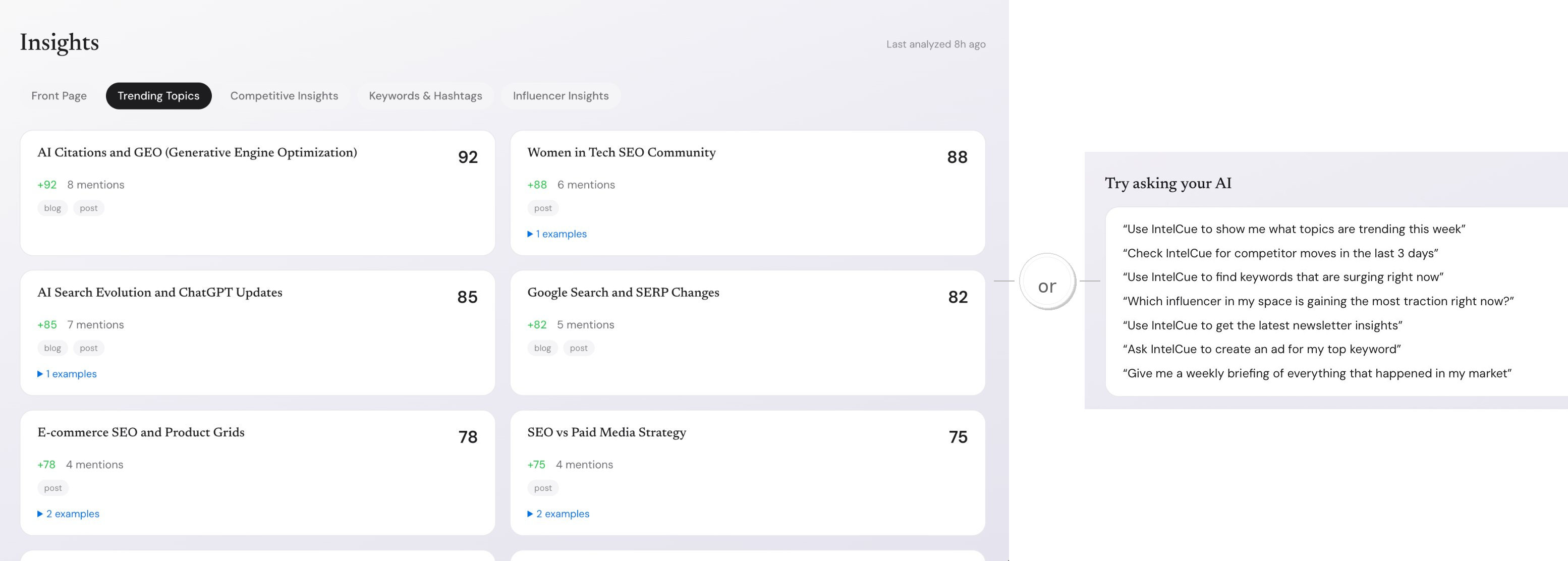 Our AI continuously monitors all your sources, detecting trends, competitive moves, and extracting keywords.