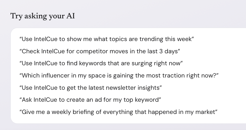 IntelCue is an AI-powered competitive intelligence platform that continuously monitors newsletters, blogs, LinkedIn profiles, news feeds, Google Ads, websites, patents, and SEC filings. It uses AI to detect trending topics, surface competitive moves, extract keywords, and generate content ideas, all accessible directly inside Claude and ChatGPT via the Model Context Protocol (MCP).