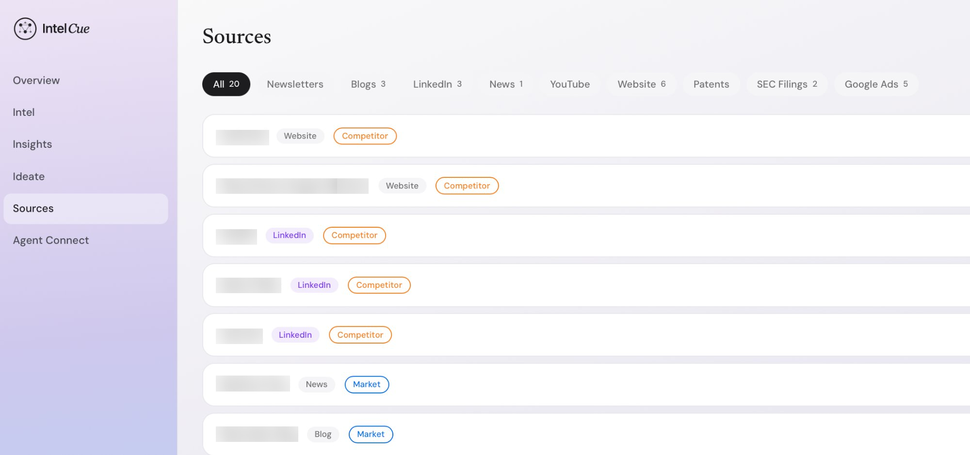 Track newsletters, blogs, LinkedIn profiles, news feeds, YouTube channels, patents, SEC filings, Google Ads, and more.